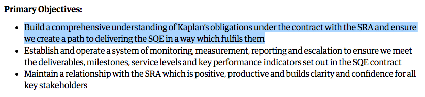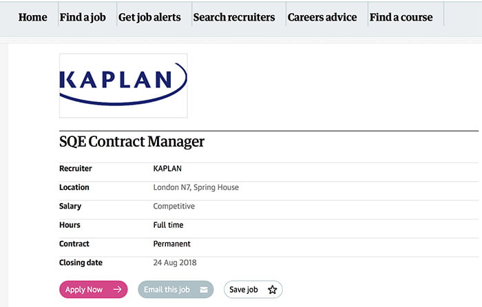 Posted to The Guardian‘s job page, the ad shows the law school is looking to recruit an “SQE Contract Manager” to “build a comprehensive understanding of Kaplan’s obligations under the contract with the SRA.”