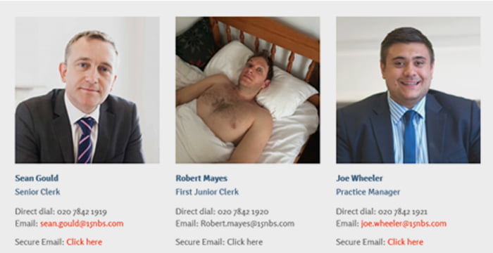 This isn’t the first time a chambers website has caught Legal Cheek’s eye: step forward London’s 15 New Bridge Street. In 2016, we noted that a member of the criminal set’s clerking team had punted for a very laidback profile photo.