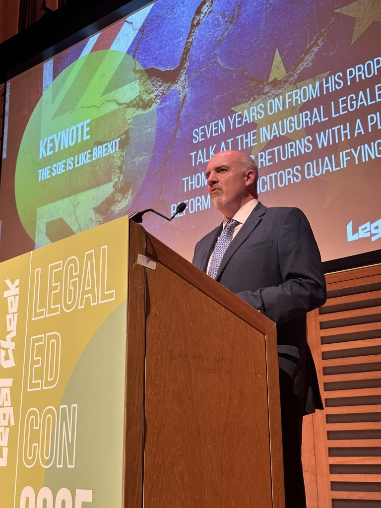 “It struck me in 2018 that things going on with Brexit and with the SQE were similar,” Brooks said, before catching the crowd up on his thoughts. To much chuckling from the audience, he recalled that back then “folks were told the SQE would create better candidates, be a cheaper route to qualification, and be more inclusive — with the data to back it up.”
