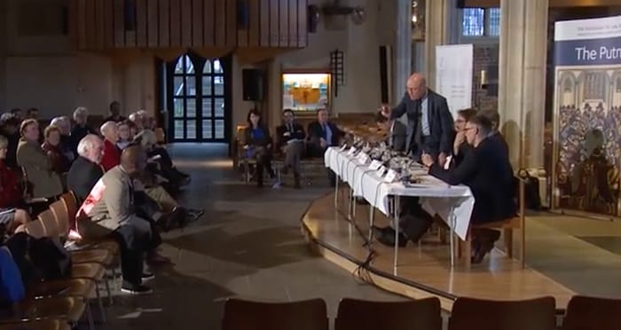 The footage, posted online earlier today by Rozenberg himself, shows a man enter the church and sit on the front row of the audience, before attempting to interrupt one of the panellists.